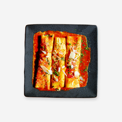 Nos pâtes fraîches roulées, farcies de ricotta & d'épinards, le tout nappé de notre sauce tomate maison, gratiné et garni de parmesan frais